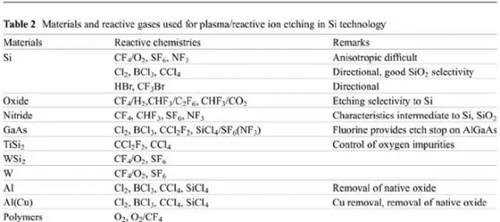 µ¥¾§¹èÒÔÍâµÄÐí¶àÖÊÁÏÒ²¿ÉÒÔͨ¹ýµÈÀë×Ó¿ÌÊ´ÒªÁì¾ÙÐд¦Öóͷ£ £¬ºÃ±È£º¶à¾§¹è¡¢µª»¯¹è(SiNx)¡¢Ñõ»¯¹è¡¢²£Á§¡¢»¯ºÏÎï°ëµ¼Ìå¡¢½ðÊô¡¢¹è»¯ÎïºÍ¾ÛºÏÎïµÈ¡£´¦Öóͷ£²î±ðµÄÖÊÁÏÓõ½µÄ·´Ó¦ÆøÌåÒ²·×ÆçÑù £¬Ò²¿ÉÒÔÓøö»ìÏýÆøÌåÀ´»ñµÃÌØ¶¨µÄ¿ÌÊ´Ñ¡Ôñ±È¡£±í2ÊDzî±ðÖÊÁÏËùÓõ½µÄ·´Ó¦ÆøÌå¡£