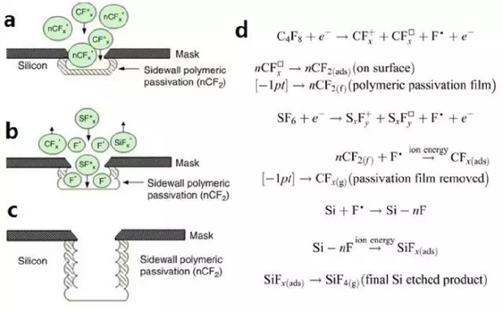 µÈÀë×Ó¿ÌÊ´ÊǽÓÄɏ߯µ»Ô¹â·Åµç·´Ó¦ £¬Ê¹·´Ó¦ÆøÌ弤»î³É»îÐÔÁ£×Ó £¬ÈçÔ­×Ó»òÓÎÀë»ù £¬ÕâЩ »îÐÔÁ£×ÓÀ©É¢µ½Ðè¿ÌÊ´µÄ²¿Î» £¬ÔÚÄÇÀïÓë±»¿ÌÊ´ÖÊÁϾÙÐз´Ó¦ £¬Ðγɻӷ¢ÐÔ·´Ó¦Îï¶ø±»È¥³ý¡£¶Ô¹è»ùÖÊÁϵĻù±¾¿ÌÊ´Ô­ÀíÊÇÓá°¹è-±¡±¼üÈ¡´ú¡°¹è-¹è¡±¼ü £¬´Ó¶ø±¬·¢»Ó·¢ÐԵĹè±»¯ºÏÎï¡ £¿ÌÊ´¹è»ùÖÊÁϵĿÌÊ´ÆøÌåÓÐCF4¡¢C2F6ºÍSF6µÈ¡£ÆäÖÐ×î³£ÓõÄÊÇCF4¡£CF4×Ô¼º²»»á  Ö±½Ó¿ÌÊ´¹è¡£µÈÀë×ÓÖеĸßÄܵç×Óײ»÷CF4·Ö×Óʹ֮Áѽâ³ÉCF3¡¢CF2¡¢CºÍF,ÕâЩ¶¼ÊǾßÓм«Ç¿»¯Ñ§·´Ó¦ÐÔµÄÔ­×ÓÍÅ¡£CF4µÈÀë×Ó¶ÔSiºÍSiO2ÓкܸߵĿÌÊ´Ñ¡Ôñ±È £¬ÒÔÊǺÜÊʺϿÌÊ´SiO2ÉϵĶྦྷSi¡££¨×¢£º¿ÌÊ´Ñ¡Ôñ±ÈS=E1/E2 £¬ÌåÏÖÔÚͳһ¿ÌÊ´Ìõ¼þÏ £¬±»¿ÌÊ´ÖÊÁϵĿÌÊ´ËÙÂÊÓëÁíÒ»ÖÖÖÊÁϵĿÌÊ´ËÙÂʵıȣ©ÔÚCF4ÖвôÈëÉÙÁ¿µÄÆäËûÆøÌå¿É¸Ä±ä¿ÌÊ´µÄÑ¡Ôñ±È¡£²ôÈëÉÙÁ¿ÑõÆø¿ÉÌá¸ß¶ÔSiµÄ¿ÌÊ´ËÙÂÊ£»²ôÈëÉÙÁ¿µÄÇâÆøÔò¿ÉÌá¸ß¶ÔSiO2µÄ¿ÌÊ´ËÙÂÊ¡£