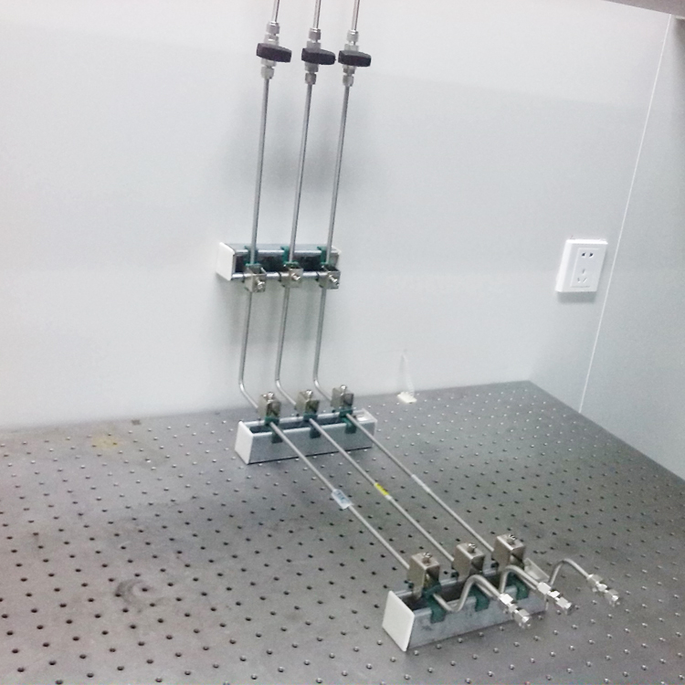 3、再次是解决气瓶压力的问题。每种气体可以将多瓶气体并联然后通过一个出口统一减压后运送气体至使用点。由于气瓶间是相对自力的,整个气路系统压力最大的地方也是气瓶出口处,因此这种方法将气瓶压力可能爆发的危险缩小至气瓶间内,可对人体及仪器的危险可降到最低。